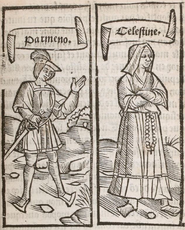 The left panel depicts Calisto’s servant Pármeno, who is wearing a hat and has a sword mounted on his belt. To the right, we see Celestina wearing a robe and a veil, with what appears to be a rosary hanging from her waist. Both figures are placed outside.The left panel is identical to those found on pages 60, 173, and 187, and nearly identical to those found on pages 263 (where it is labeled ‘Sosia’), 299 (labeled ‘Pleberio’), and 326 (labeled ‘Sosia’). The right panel is identical to the panel found on the title page, and on pages 70, 114, 208, and 225 of the text.