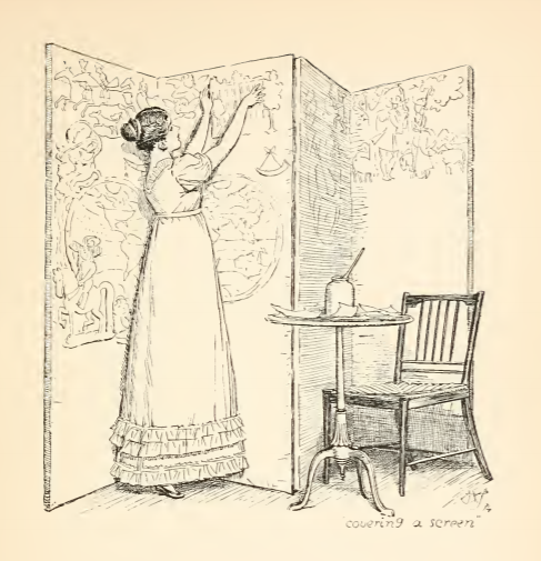 In this image Lizzy covers a screen around Jane’s bed at Netherfield. After hearing of Jane’s illness, Lizzy walked to Netherfield herself to care for Jane. This scene occurs in chapter 8. The characters are shown in the traditional regency style. Lizzy wears a regency style dress with an empire waistline. The regency period dated to the early nineteenth century (1811-1820) when George, Prince of Wales, later George IV (r. 1820-1830), reigned as regent for his mentally ill father, King George III (r. 1760-1820). The regency period is associated with the rise of neoclassicism in art and fashion.