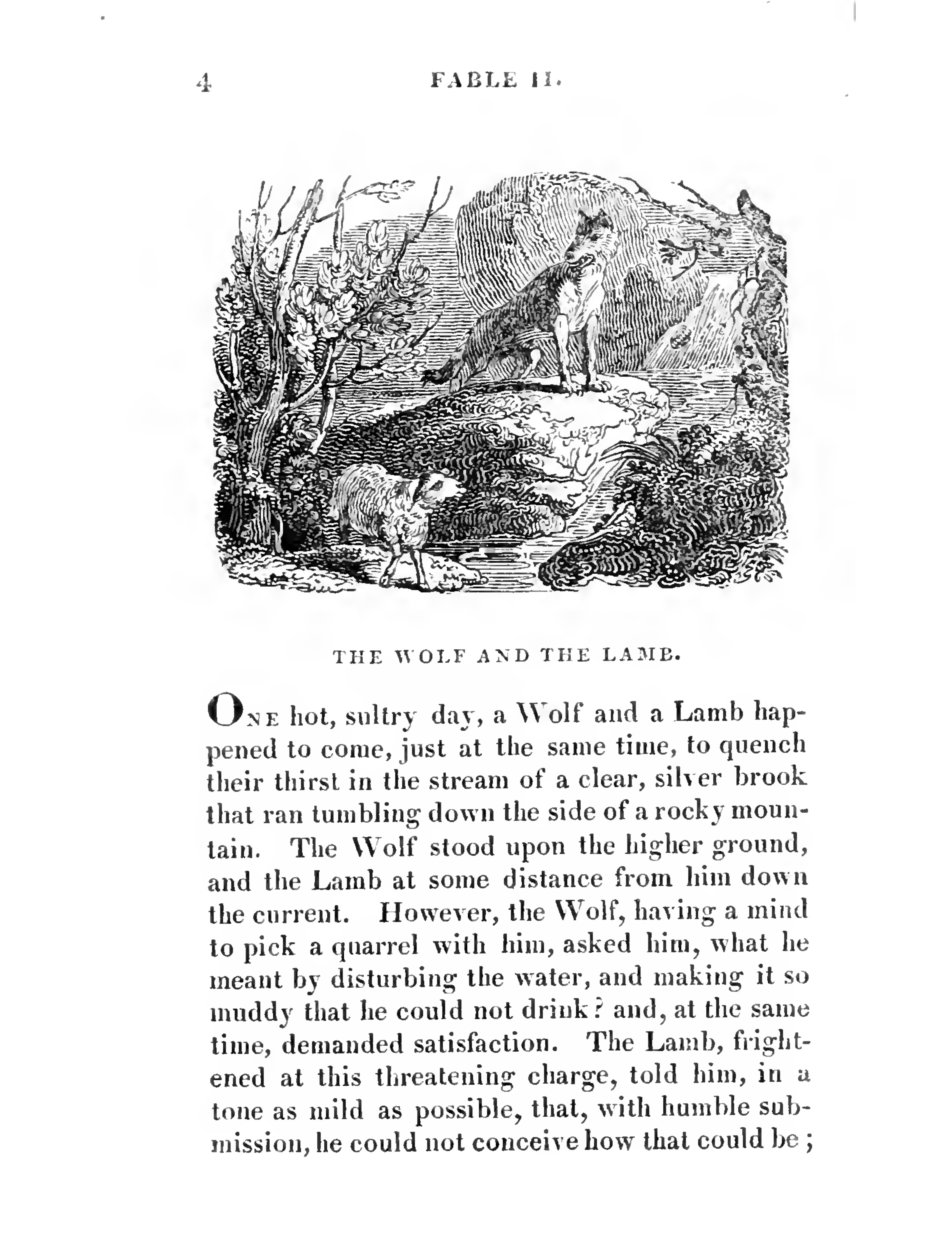 In the forest nearby a waterstream, a Wolf and a Lamb came to ease their thrists. The Wolf stood on a rock of the higher ground while the Lamb was located at some distance from him downstream. The wolf showed annoynance at the Lamb while accusing him as muddenifing the water. Fightened and submissive, the Lamb claimed his stand.