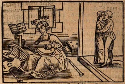 This engraving depicts Sappho, the famous poetess from Lesbos, on the left side of the engraving playing the lyre. There are other stringed instruments and sheet music surrounding her. She was famous for her lyric poetry. Boccaccio explains that Sappho was in love with a man who did not share the mutual feeling, and this is the reason as to why her music and poetry was so somber. The man that she loved is depicted on the right side of the engraving kissing another woman.