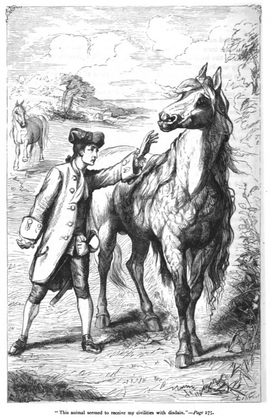 Here we see Gulliver's first encounter with the Houyhnhnms. He greeted the Houyhnhnm as he would treat a horse, and the Houyhnhnm was offended to be treated as an animal. Gulliver first met the Houyhnhnms after an encounter with the Yahoos.