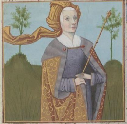 This illumination depicts a portrait of Queen Jocasta of Thebes. Boccaccio explains that Jocasta is widely renown for unknowingly marrying her son, Oedipus. After an oracle revealed the truth about her husband being her son, Oedipus gouged his eyes out and Jocasta killed herself.