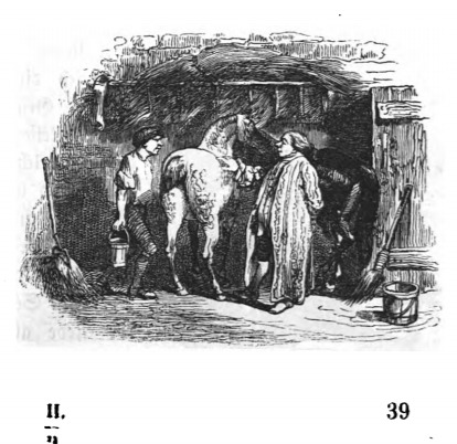 After his return to England, Gulliver bought two uncastrated stallions. Gulliver spent most of his time with these horses, as he found their company preferable to human company, and reminded him of his time with the Houyhnhnms. Gulliver says he spends at least four hours each day speaking with the horses. The same image appears in the 1839 Krabbe edition.