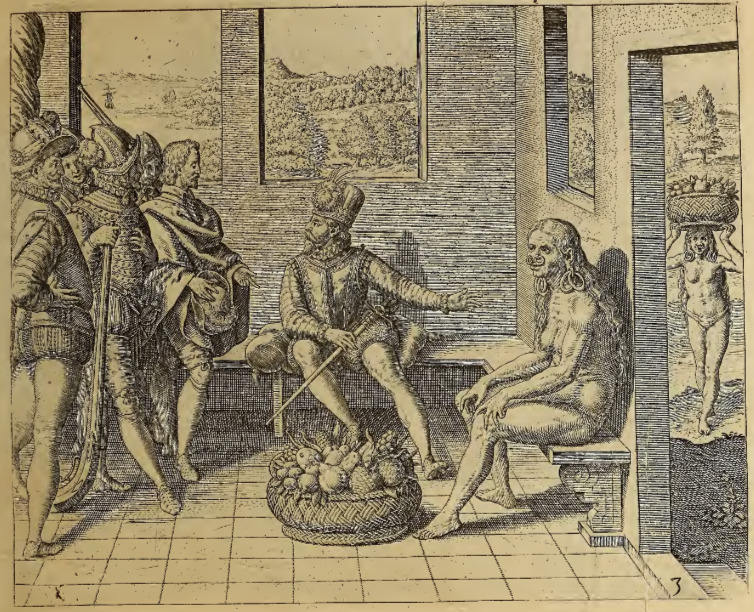 Inside a structure, and Indigenous woman and a European man sit on a bench, while several other European men stand nearby in conversation. The woman is nude with long, unbound hair. She wears two hoop earrings in each ear and two smaller hoops in her nose. The European men are all finely dressed in doublets and hose, and several wear fine hats or helmets. The man on the bench is seated on a cushion and gestures towards the Indigenous women while conversing with the other men. He carries a thin sword, while one of the other men holds a musket. In the center of the group on the floor there is a large basket of fruit, a gift presented by the Indigenous woman. Another woman can be seen on the right, approaching the building with another large basket of fruit. This image is identical to one found on page 153 of Frankfurt, 1594.