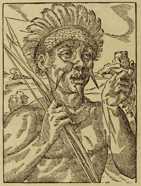 An Indigenous king or chief is shown in portrait from the chest up. He wears a feathered headdress and has three pointed face stones – one in each cheek and one in his chin. He also wears multiple strands of beads around his neck. The man carries a bow and two arrows in his right hand and gestures with one finger raised with his left hand. This image is identical to one found on page 955 verso of Paris, 1575 (Chaudière).