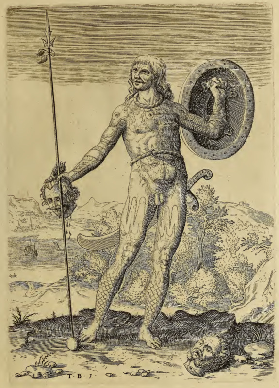 An Indigenous man is shown from the front. He carries a shield strapped to his left forearm and a long spear in his right hand. Also in his right hand is a severed human head, another head lays on the ground at his feet. His hair is long, he wears a twisted cord around his neck, and a sword with a curved blade hangs from another cord around his waist. He is nude, and his body is covered in painted designs. The Picts were an Indigenous group who lived in Britain long before the author’s time. Images of Picts were included in this book so that readers could compare their customs to those of the Indigenous people living in Virginia.