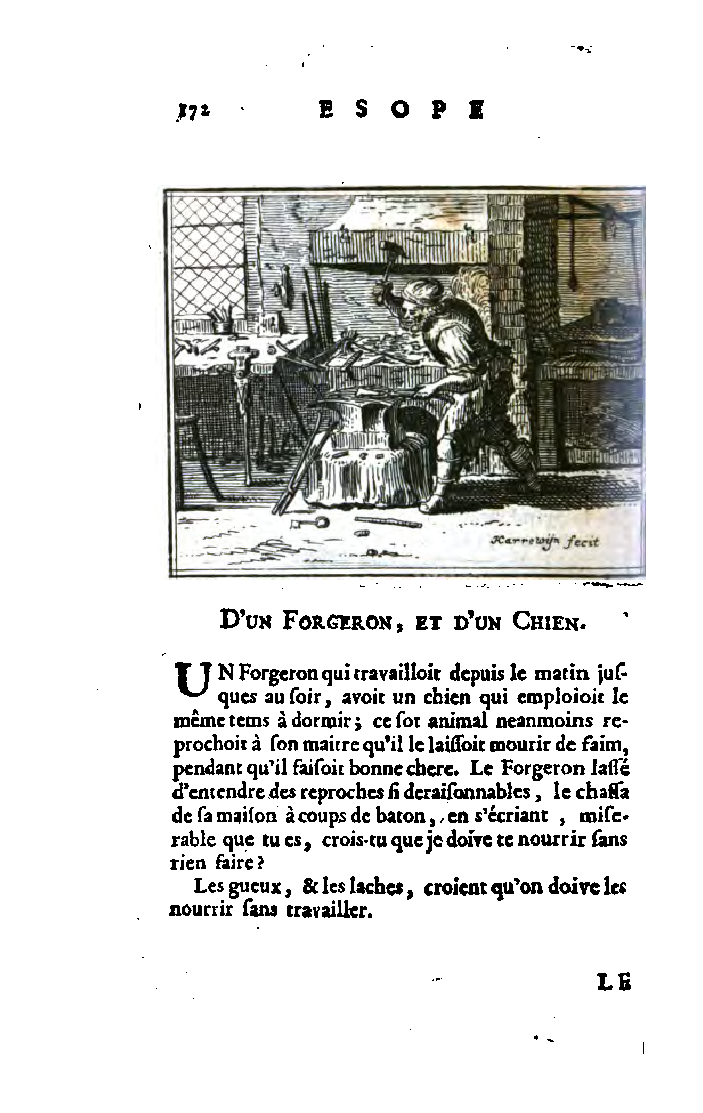 A blacksmith who worked from morning until the end of the day, had a dog who used the same time to sleep; this silly animal reproached his master for letting him die of hunger, while he was doing work. The blacksmith, sick of hearing such a reproach, hit him with a stick, saying, You poor thing, do you think I have to feed you if you don't do anything?