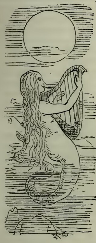- A mermaid with long hair and a thin twisting tail floats near some rocks, mostly out of the water. She is playing a small harp beneath the full moon, which forms the letter O from Our.