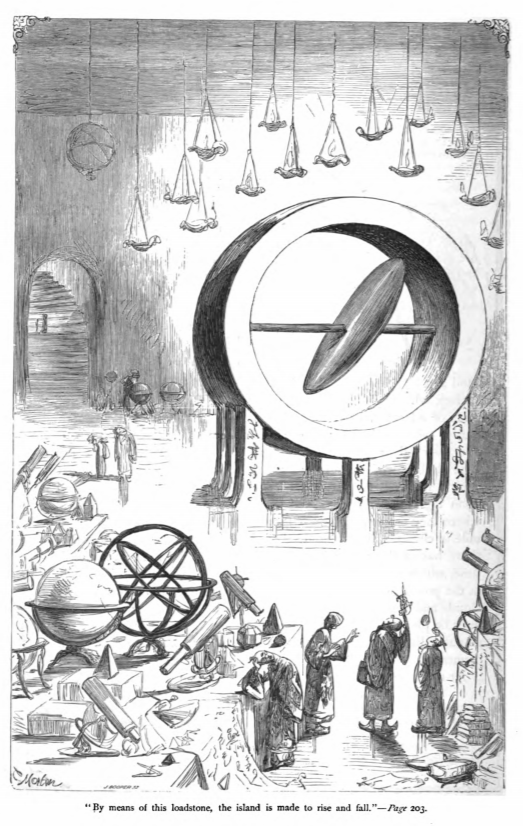 Here we see the technology used by Laputan scholars to move the island. The Emperor of Laputa could move the island over various parts of Balnibarbi – the land below Laputa. The Emperor would move the island to punish people on Balnibarbi so that Laputa would block the sun from Balnibarbi causing the crops to fail. If the Emperor felt so inclined, he could cause the island to drop onto Balnibarbi, but he had never done this for fear of damaging the adamantine bottom of Laputa.