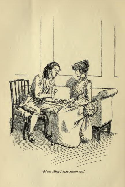 In this image John Dashwood assures Elinor that Mrs. Ferrars would have found a match between Edward and Elinor far more agreeable that his marriage to Lucy. Elinor went to visit her half-brother and sister-in-law shortly after the news of the engagement, but after Fanny had somewhat recovered from the shock. This scene occurs in chapter 41. The characters are shown in the traditional regency style. Elinor wears a regency style dress with an empire waistline. John Dashwood wears a waistcoat and tailcoat with breeches and a cravat. The regency period dated to the early nineteenth century (1811-1820) when George, Prince of Wales, later George IV (r. 1820-1830), reigned as regent for his mentally ill father, King George III (r. 1760-1820). The regency period is associated with the rise of neoclassicism in art and fashion.