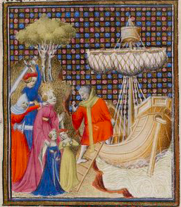 Hypsipyle became the Queen of Lemnos when she saved her father from murder and had him sent to Chios on a ship. Her father wears a red cloak and boards the ship to the right of the image. Hypsipyle is in the center of the image wearing a crown and a pink gown, standing with two children that were born to Jason. The children were required to be sent away, so she had them sent to her father in Chios, revealing that he was still alive after all. This caused her subjects to turn against her and send her away. Her subjects are seen to the far left of the image, sending Hypsipyle away.