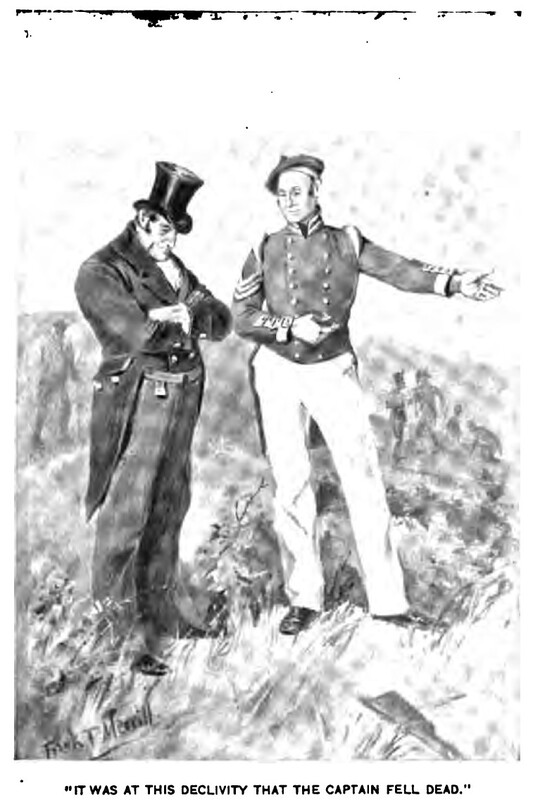 The image depicts a scene from page 352, in which the Sergeant shows John Osborne where his son died. The Sargeant, in military uniform, is standing in a field with one hand in front of him and gesturing outwards with the other. Next to him John Osborne is dressed in a top hat and tailcoat, looking down with his arms crossed. The silhouettes of other soldiers can be seen in the background. The quote given as the title of the image is an abridged version of the one given in the text.