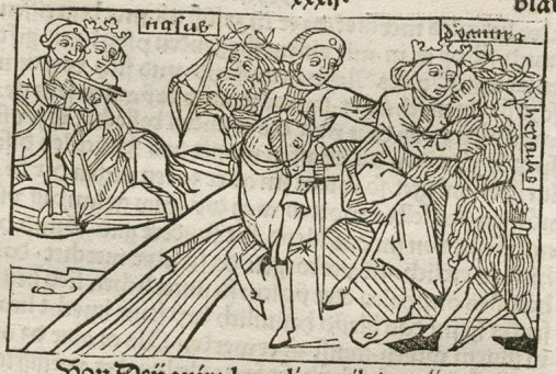 Hercules is depicted on the right side of the engraving holding his new wife Deianira in his arms as they attempt to cross the Evenus river. Hercules is illustrated with a wreath on his head and a bow and arrow by his legs. His name is engraved beside his body. Deianira is illustrated wearing a crown and has her name engraved above her head. A man named Nessus is depicted beside Deianira, holding his arm out to her as he offers to take her across the river on horseback. Boccaccio explains that Nessus was riding horseback, however, Nessus is known to be a centaur in Greek mythology. Boccaccio explains that Nessus betrayed Hercules’ trust and began to run away with Deianira after crossing the river. Hercules uses a poison infused arrow to shoot Nessus and rescue his wife. This is illustrated in the background on the left side of the engraving. Hercules’ bow is in hand, and his arrow is sticking out of the chest of Nessus.