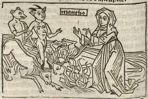 This engraving depicts Manto, the daughter of the famous seer Tiresias. She is depicted with her body leaning over a burning fire. We know this figure is Manto as the creator engraved her name beside her head. Boccaccio explains that Manto became an incredible seer just like her father. She uses the movement and colour of the fire’s flames to tell the future, which is why there is a fire in the engraving. She also used the entrails of animals such as sheep and oxen for signs of the future. There is an ox and a sheep illustrated in the engraving with their organs sticking out from their bodies. There are two distinct looking characters in the background of the engraving, which signifies Manto’s involvement in the dark arts in summoning spirits and gods from the underworld.