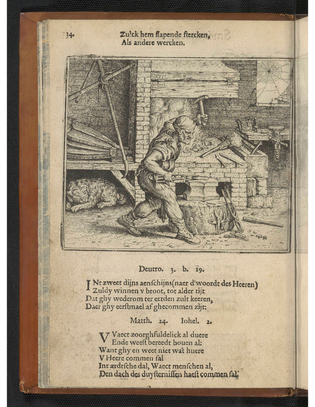 A man working in a forge. A dog sleeps under a bench in the back left of the room. The man raises a hammer as he works on a piece of metal. A fire burns in the back of the forge. Tools are scattered throughout the room.