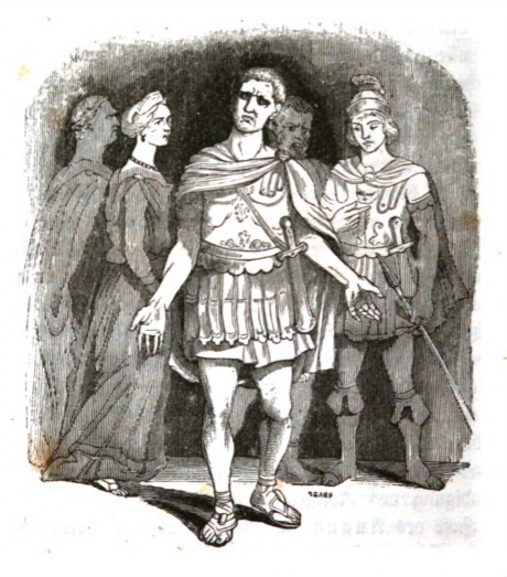 One of the men who appeared before Gulliver was the commander of a ship who fought at the Battle of Actium in 31 BCE when Octavian (later Augustus) defeated Marc Antony and Cleopatra. The commander was quite successful at the battle, however, he was overlooked by Augustus when it came time to appoint a commander of a greater ship. This position went to a young man who waited on one of the Emperor’s mistresses, showing the corruption of Augustus’ court, like many other courts throughout history. The commander was charged with neglect of duty after he asked to be promoted, and he retired to a poor farm outside Rome. His ship was then given to a favourite page of the Vice-Admiral. The commander’s son who was killed at the battle appears with the commander. Intrigued by the story of this commander, Gulliver called upon Agrippa, a friend of Octavian and the admiral at the Battle of Actium, who confirmed this story. Agrippa’s version of the story paints Octavian in a much more favourable light, however. The same image appears in the 1843 Krabbe edition.