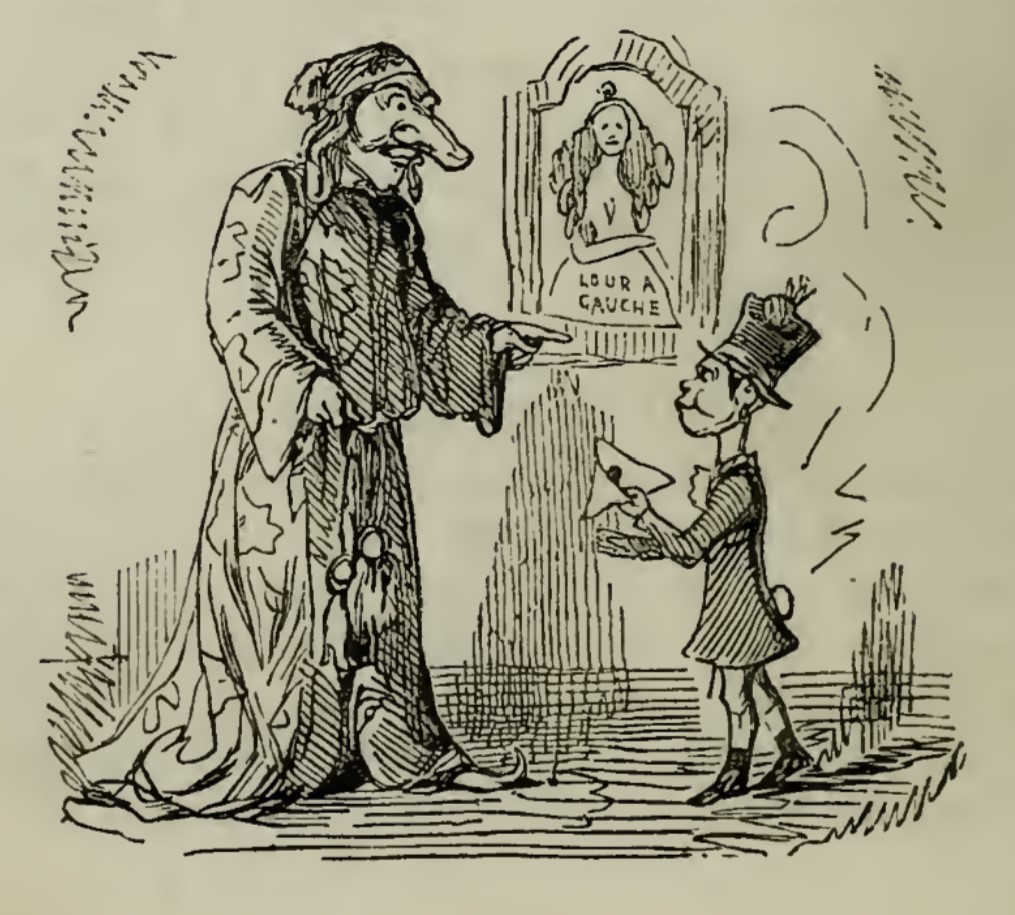 The illustration depicts a scene which might have been part of the story if it was written in a different style. The Marquis of Osbourne, in an embellished robe, has handed a letter to his ‘petit tigre’ for deliver to Lady Amelia. In the background of the image hangs a portrait on the wall of that same woman, with the words Lour A Gauche on her skirt.