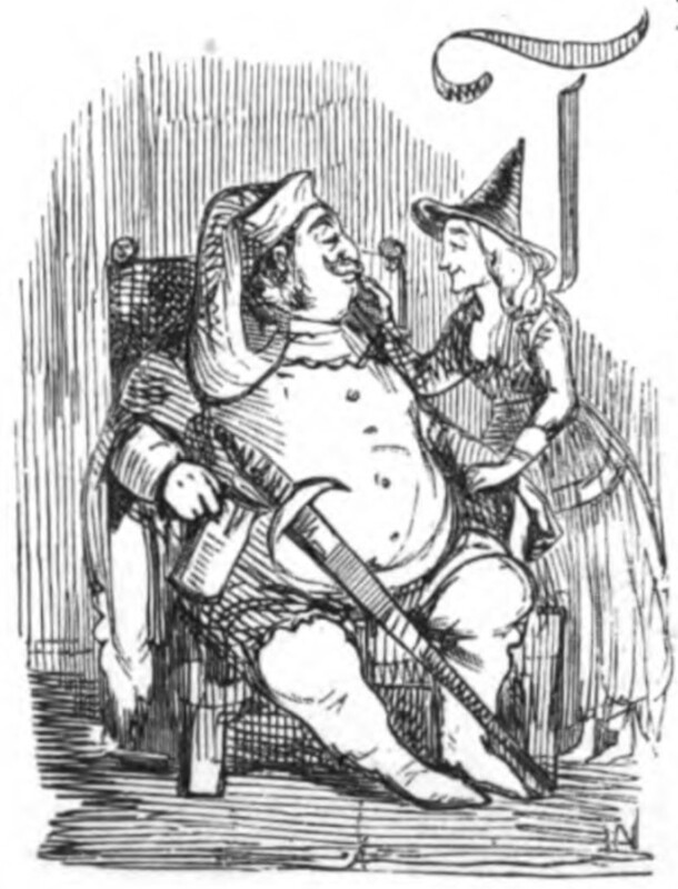 Joseph Sedley sits in a large chair with a sword leaning against his leg and a pitcher in his hand. Rebecca Crawley, dressed in a witch’s hat, leans over him, stroking his arm and his chin. To the right and above her head is the letter T from The.