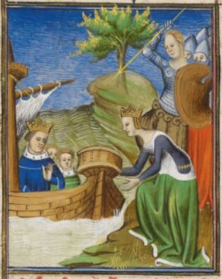This illuminated image depicts a woman named Hypsipyle saying goodbye to her father, King Thaos of Lemnos, as he sails away on a boat. Hypsipyle is illustrated standing by the shore as she pushes the ship away. Both Hypsipyle and her father are wearing crowns to demonstrate their royal status. The women of Lemnos, who are depicted on the right side of the image, had planned to kill every man of the city to eliminate the patriarchy. Hypsipyle, unable to allow her father to die, told him of this plan and helped him escape by means of this boat. The women of Lemnos are illustrated wearing armour and carrying spears and sword.