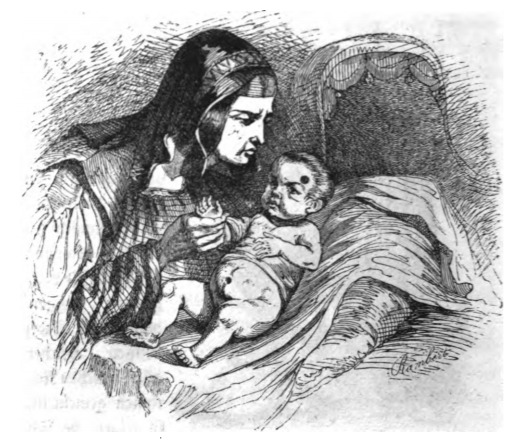 Here we see a child who is immortal. There is a small population of immortal people on Luggnag. These people are identified by a spot on their forehead, which is red when the child is born and changes colour throughout their lives. The same image appears in the 1843 Krabbe edition.