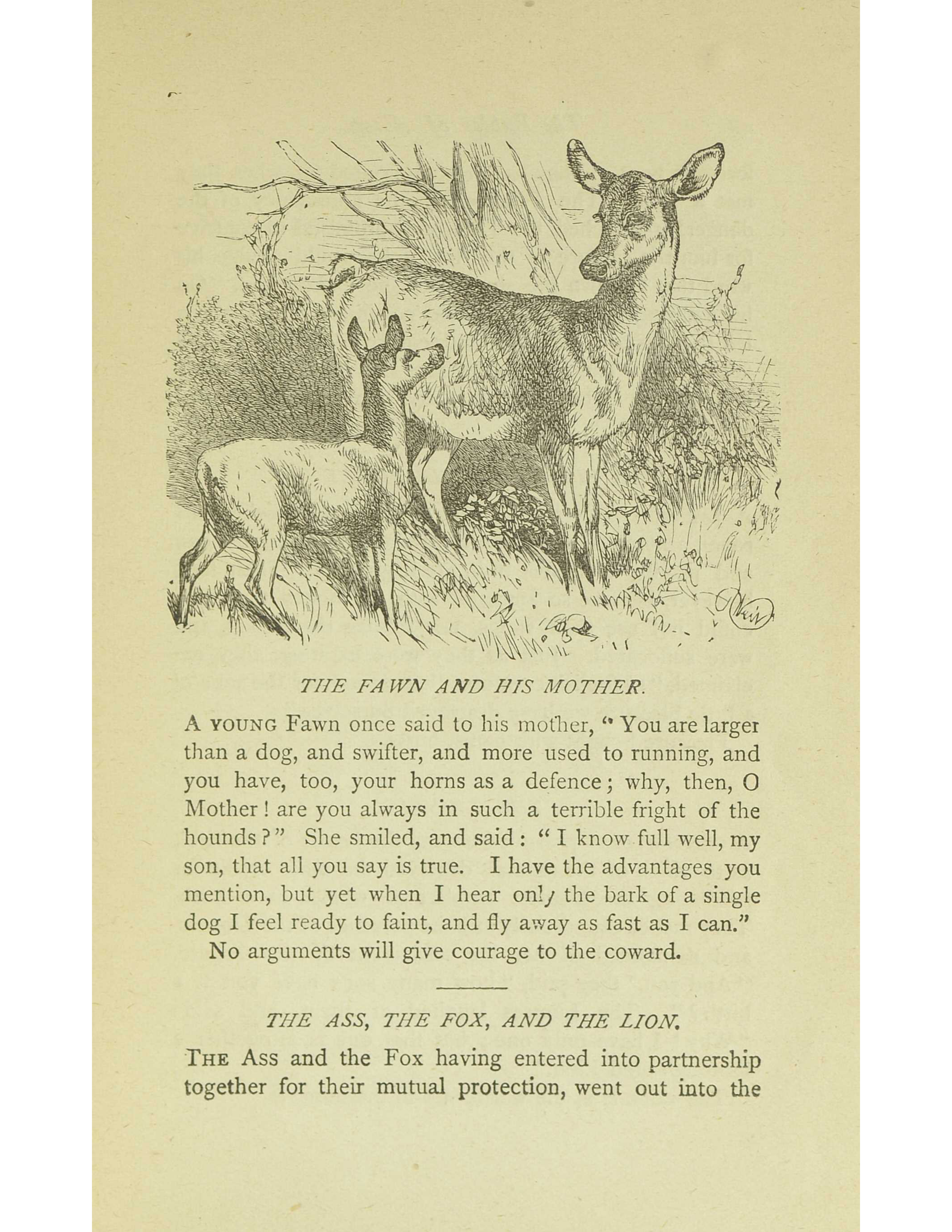 In a forest, a small fawn and his mother are looking at one another near a tree. The fawn is still small and must look up to his mother to see her. He is on the left-hand side of the image, while the mother stands tall on the right-hand side, and is looking down at her son. Both have their ears perked up. Grass and wildflowers grow everywhere on the ground where they are standing.