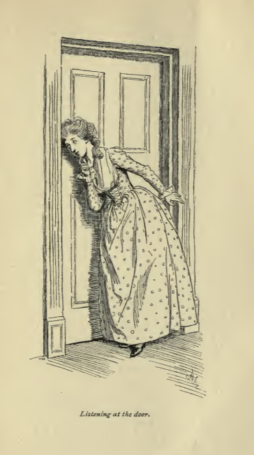 In this image Anne Steele listens at the door while Lucy and Edward were discussing their engagement. Anne reiterates what he heard at the door to Elinor while on a walk in Hyde Park. Elinor wondered how she knew everything and asked if she was in the room while they discussed their plans. She said she was listening at the door and Elinor was appalled at the impropriety of this. This scene occurs in chapter 38. The characters are shown in the traditional regency style. Anne Steele wears a regency style dress with an empire waistline. The regency period dated to the early nineteenth century (1811-1820) when George, Prince of Wales, later George IV (r. 1820-1830), reigned as regent for his mentally ill father, King George III (r. 1760-1820). The regency period is associated with the rise of neoclassicism in art and fashion.