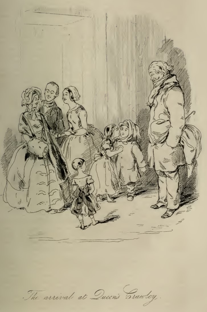 Matilda Crawley greets her cousin, the younger Rawdon Crawley, while her brother Pitt Binky hangs back and watches. To their side is Mr. Rawdon Crawley, watching his son. In the background, Sir Pitt and Lady Jane are greeting Rebecca Crawley, who has just arrived at Queen’s Crawley with her husband and son. Below the illustration is printed in cursive its title, The arrival at Queen’s Crawley.
