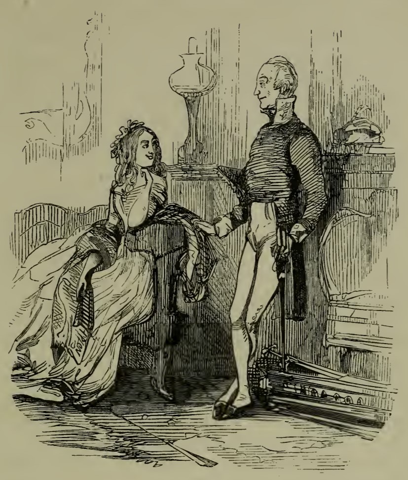 Sir Pitt Crawley leans against a fireplace at his brother Rawdon Crawley’s house. He is dressed in his Court suit and has a thin sword at his side. Mrs. Rebecca Crawley is seated on a chaise next to him, turned in his direction to admire his uniform.