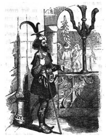 Here we see a centry posted outside Gulliver’s door in Luggnagg. The officer with whom Gulliver spoke said he must be confined until permission from the Court could be granted to Gulliver to stay on the island as he was a guest. Despite his confinement, Gulliver’s quarters included gardens. Gulliver had several visitors during his confinement who came to ask him about his home, with the help of an interpreter Gulliver hired while on the ship from Glubbdubdrib. The same image appears in the 1843 Krabbe edition.