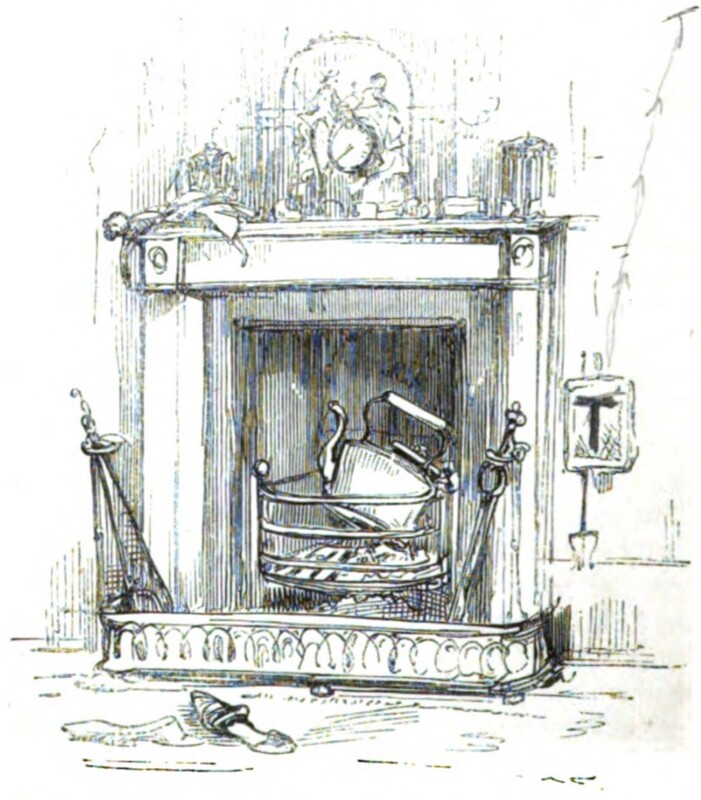 An unburning fireplace, with the kettle fallen onto the coals. On the mantle is a clock with two figures. A pair of slippers are abandoned in front of it, and on the wall to the side, the poker-holder is decorated with the letter T from There, with markings leading up the wall to another marking of the same letter.