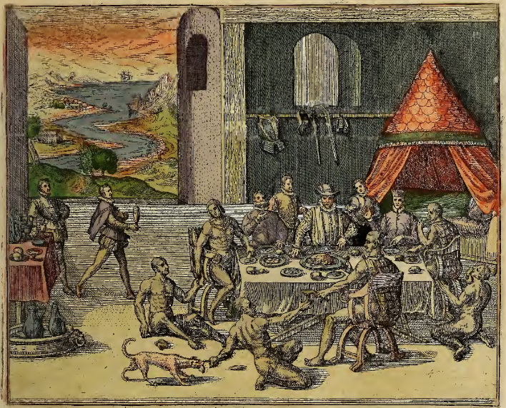A group of Spaniards, one of whom is Diego Guttierez, governor of Costa Rica, share a meal with several Indigenous leaders, called Caciques. The group dines in a large structure with a canopy bed in one corner, two dining tables and wooden chairs. Several pieces of armor and weaponry have been hung on a rail near the bed. At the table, three Indigenous men wearing capes of feathers and necklaces (the Caciques) sit in chairs, while three more Indigenous men sit on the floor, one beside each leader. One of the Caciques passes meat to the man near him on the floor, who in turn feeds it to a dog. This image is identical to one found on page 145 of Frankfurt, 1595.