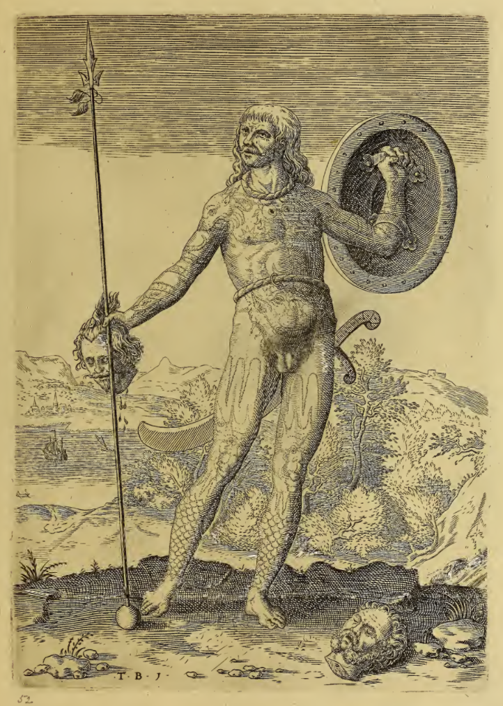 An Indigenous man is shown from the front. He carries a shield strapped to his left forearm and a long spear in his right hand. Also in his right hand is a severed human head, another head lays on the ground at his feet. His hair is long, he wears a twisted cord around his neck, and a sword with a curved blade hangs from another cord around his waist. He is nude, and his body is covered in painted designs. The Picts were an Indigenous group who lived in Britain long before the author’s time. Images of Picts were included in this book so that readers could compare their customs to those of the Indigenous people living in Virginia.