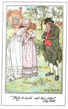 Here we see Elizabeth, Jane and Mr. Bennet reading a letter from Mr. Gardiner telling them that he has located Lydia and Mr. Wickham in London. Mr. Gardiner is Mr. Bennet’s brother. Elizabeth reads the letter as Jane looks over her shoulder. The letter says that Mr. Wickham will marry Lydia, Jane and Elizabeth’s sister, if Mr. Bennet will provide him with an income. Mr. Bennet gladly agreed to save the reputation of the family. Lydia’s running away with Mr. Wickham while unmarried threatened the reputation of the whole family and put her sisters’ marriage prospects in jeopardy. This scene occurs in chapter 49 as noted underneath the title of this image. The characters are shown in the traditional regency style, with Mr. Bennet wearing waistcoat, tailcoat, and knickers that stopped at the knee. Elizabeth and Jane wear the regency style dress with an empire waist. Their hair is worn tied up, as was tradition for women after their coming out before the queen, signaling her entrance into society. Jane wears a bonnet, a popular fashion of this period to protect her from the sun. Bonnets were especially popular because in this period a common pastime for women was going out on walks. The regency period dated to the early nineteenth century (1811-1820) when George, Prince of Wales, later George IV (r. 1820-1830), reigned as regent for his mentally ill father, King George III (r. 1760-1820). The regency period is associated with the rise of neoclassicism in art and fashion.