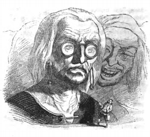 In this image we see two Giants looking at Gulliver. The Giant in the front wears circular glasses with shoulder length hair and a beard. He also has hoop earrings with beads on the bottom. The second giant stands behind the left shoulder of the first. He wears a cap and has a large grin. Gulliver stands on the table at shoulder height, leaning back from the giants. The same image appears in the 1843 Krabbe edition.