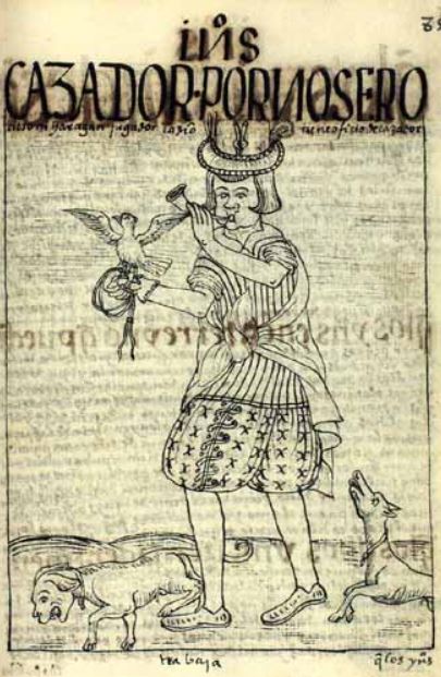 This image depicts an Andean hunter in Spanish colonial Peru. The hunter is illustrated wearing Spanish clothing with puffed trousers and a tunic. There is a cloak around his neck that he has tied at the waist, most likely to keep it out of his way as he hunts. He is depicted standing in the centre of the image as he blows through a horn and holds a hawk on his right hand. The hunter also has dogs by his feet. Hunters would raise dogs and hawks as companions for the hunt as well as to guard homes from thieves. The hunting and guard dogs were highly protected, and if anyone were to harm or kill the dogs they would be punished and charged fees. The caption at the bottom of the image reads, trabajo [labour].