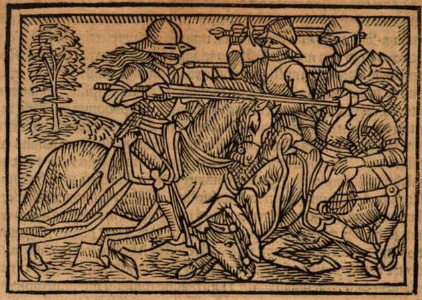 This engraving depicts Penthesilea, the queen of the Amazons, riding a horse into battle with her lance pointed towards her enemies. She is depicted with her long hair sticking out from her helmet to identify her as a woman. Penthesilea, as Boccaccio describes, was a great warrior. She wanted to secure a strong heir for the Amazons, so she sought out Hector of Troy to provide her with an heir. She fought in a battle against the Greeks to prove herself worthy of bearing Hectors child. The enemies she is fighting against in the image are the Greek soldiers in the Trojan War.
