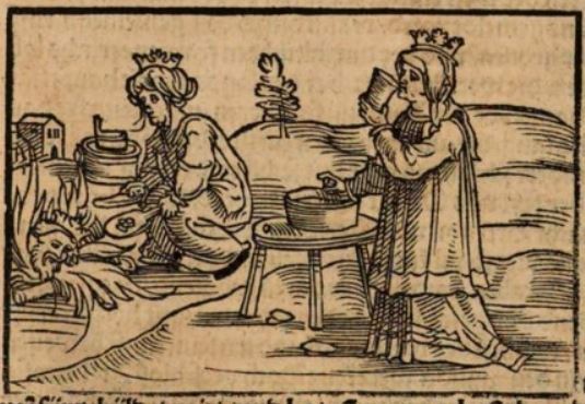 Artemisia was married to Mausolus, the king of Caria. Boccaccio explains that when he died, Artemisia was so grieved by his death that instead of putting his ashes in an urn after his cremation, she drank the ashes in order to be closer to him. The left side of the engraving depicts Artemisia cremating her husband’s body in a fire. Mausolus’ head is visible in the fire. Artemisia is illustrated scooping her husband’s ashes. The right side of the engraving depicts Artemisia drinking her husband’s ashes.