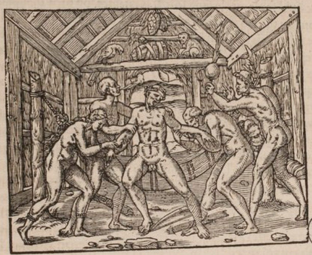 Inside a structure, a group of Indigenous people tend to a sick man. The man stands in the middle of the group with his arms outstretched to either side. Two people each hold one of the sick man’s arms, with the person on the right touching his lips to the man’s arm. Another man stands behind the afflicted man and holds him by the shoulders. To the right, a man wearing a feathered headdress holds a rattle or other ornament over the group. There is a hammock slung between two beams of the structure behind the group, above them a monkey and a bird sit on another beam and a bow and bundles of arrows lie on the ground. This image is identical to one found on page 935 of Paris, 1575 (l’Huillier), and in Thevet’s Les Singularitez de la France Antarctique (page 88 verso of Paris, 1557 and page 88 verso of Paris, 1558).