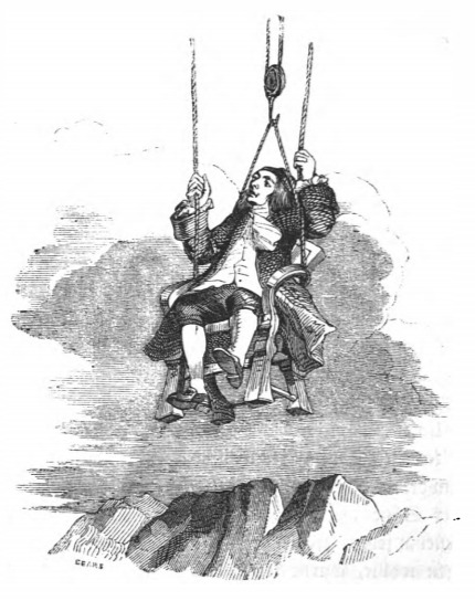 Gulliver waved his arms at the floating island of Laputa and got the attention of a few Laputans and soon a crowd assembled to see Gulliver. They lowered a chair down then raised Gulliver up to the island on the chair using a pulley system, as is seen here. Gulliver is raised up over the rocks and arrives on Laputa. The same image appears in the 1839 Krabbe edition.