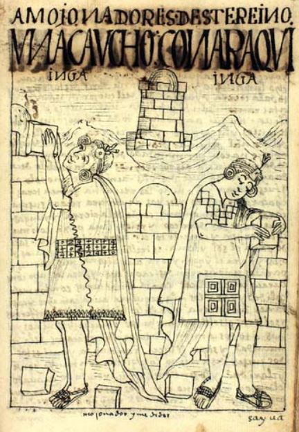 This chapter discusses the system of administrative officials in the Inca Empire. This image depicts two men named Una Caucho Inca and Conaraqui Inca establishing boundary markers within the Inca Empire. By order of the Inca king, Topa Inca Yupanqui, these men were tasked with creating ditches and landmarks to mark the borders of the territories and provinces in the empire. Both men in this image are illustrated working hard by placing bricks on a boundary marker which appears to be a walled structure. There is another territory marker in the background of the image surrounded by the Andes.