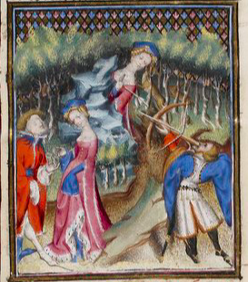 Cephalus was warned by an admirer that since he would not leave his wife, Procris, that Procris would leave him for jewels and money. Being anxious, Cephalus tested his wife by leaving town and having large gifts sent to her. This is represented on the left of the image, where Cephalus is tempting Procris with valuable gifts. Originally, Procris turned them down, but over time she accepted it. She was so upset with herself that she ran to the woods where she would live in solitude, but Cephalus retrieved her against her will. He was very upset with himself about tricking Procris, even though it went poorly. They both grew paranoid, and Procris began stalking Cephalus while he was hunting. One day, he mistook her for a wild animal and shot her, killing her by mistake. This is represented on the right of the image, where Cephalus has an arrow pointed at Procris.