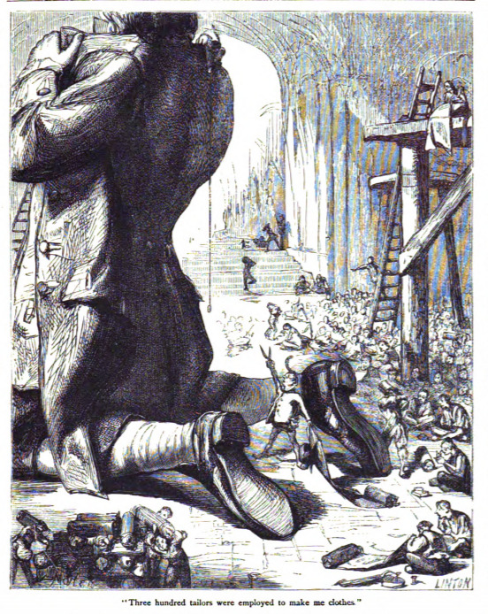 Here we see Gulliver kneeling with his back to the viewer as he is measured for new clothing. A Lilliputian drops a measuring tape down Gulliver’s back while standing on his shoulder. A ladder leans against Gulliver’s chest. Three hundred other tailors sit on the ground working on piecing together cloth large enough to make clothes for Gulliver. A cart with rolls of cloth is visible in the foreground.