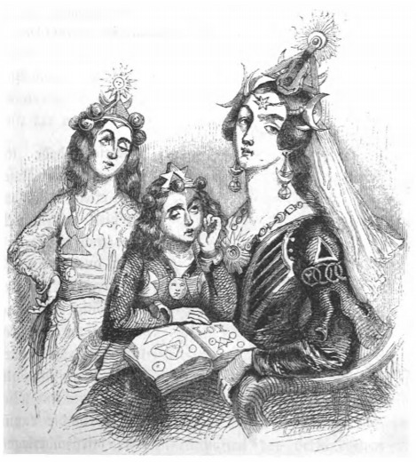 Here we see the queen of Laputa with her two children. All three figures are wearing the traditional Laputan motifs of mathematical and musical figures. The king of Laputa and his two eldest sons are not permitted to leave the island for fear that something might happen with the trajectory of the island and it might come crashing down or remain in one place blocking the sun and causing disease. These occurrences would happen if the king wanted to punish a region on Balnibarbi (the land underneath Laputa). The queen was only permitted to leave the island after she was past child-bearing years. The same image appears in the 1839 Krabbe edition.
