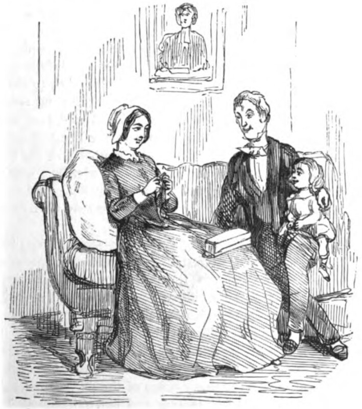 The Reverend Mr. Binny sits on a sofa with Georgy Osborne on his lap. Opposite him sits Amelia Osborne, to whom he has just proposed marriage and been turned down. She is knitting or crocheting. Above the sofa is a framed portrait of the elder George Osborne.