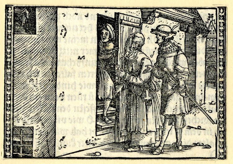 Sempronio (rightmost figure) is shown arriving at Celestina’s house to request her aid on behalf of Calisto, and he encounters Celestina (central figure) in the street. In this illustration, she is shown opening her door. Inside, we see Crito (leftmost figure) descending the staircase. Celestina and Elicia attempt to hide him from Sempronio.The entire illustration is identical to the one found on page 95 of the text (folio f1r): [Act V – Pármeno Opening the Door for Celestina and Sempronio].