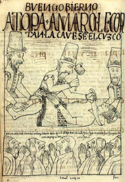 This image depicts the beheading of the young fifteen-year-old Inca, Topa Amaro Inca. The young Inca had expressed he had no desire to meet Don Francisco de Toledo, the viceroy of Peru, and the viceroy was offended by the Inca’s words. The viceroy sentenced the Inca to be beheaded for this reason. Topa Amaro Inca is illustrated laying on a table with his hands bound together. There are three Spaniards depicted aiding in the beheading. One man is holding down the Inca’s legs while another man holds the Inca’s head still. The third man is depicted holding a sword to the Inca’s neck with one hand and a hammer in his other hand. There is a group of indigenous peoples at the bottom of the image looking up at the scene of the beheading of the Inca. They are depicted crying and grieving for the young Inca. The caption written above their heads reads, ynga uana cauri maytam rinqui sapra aucanchiccho mana huchayocta concayquita cuchon [Inca Wanacauri, where are you going? Is our wicked enemy cutting your blameless neck?]. The caption at the bottom of the image reads, en el cuzco [in Cusco].