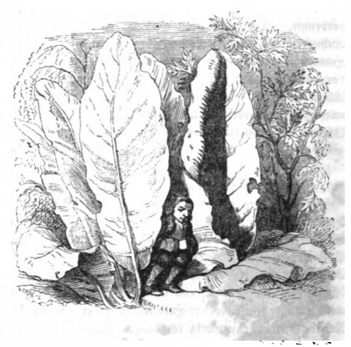 [Gulliver sits among large leaves on Brobdingnag]