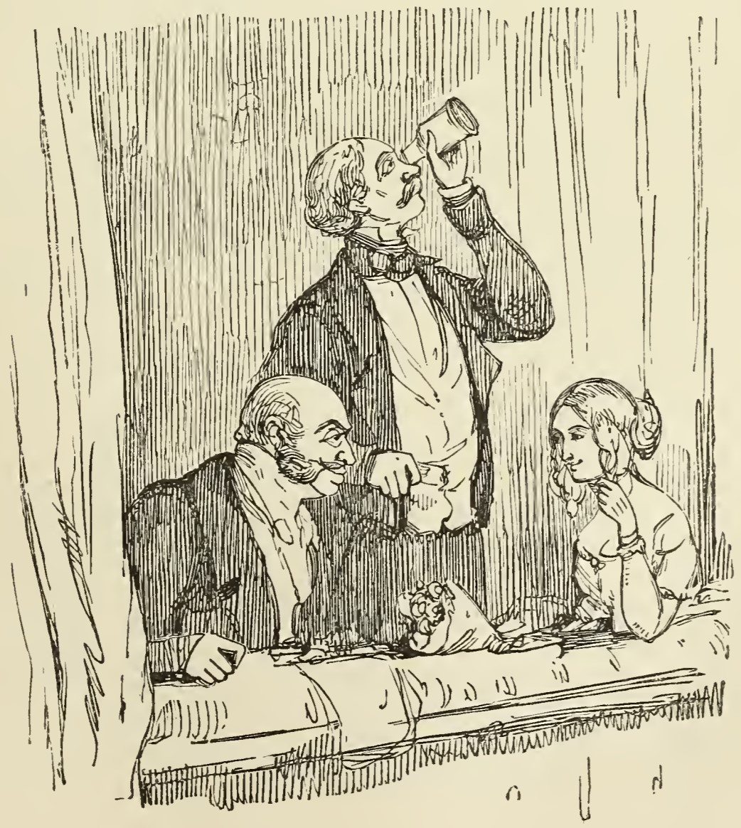 Rawdon Crawley stands in an opera box, looking up and to the right through his opera glasses. General Tufto and Rebecca Crawley are seated on either side of him, looking at each other, with a bouquet between them.