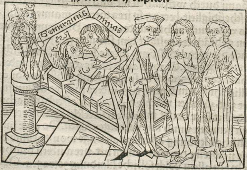 This engraving illustrates Queen Semiramis of the Assyrians lying in bed while having sexual relations with her son, Ninyas. We know that these figures are Semiramis and her son, as the creator engraved their names above their heads to identify them. There is a statue sitting on a platform on the left side of the engraving which appears to be a king. The statue is in fact Semiramis, who had a substantial military career and took part in many battles. The three almost naked women that are illustrated in front of the bed represent the women who Semiramis feared. She was afraid that they would desire her son and take her away from him. Semiramis is said to have invented the chastity belt to avoid anyone having sexual relations with her son. The women are illustrated with undergarments on, which is suggested to be the chastity belts.