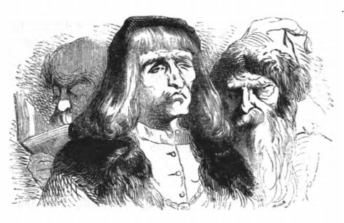 In this image, Swift is the central figure, with his teachers looking over his shoulder. The image appears in Swift’s biography, during the discussion of Swift’s university years at the Trinity College in Dublin. A shadowy figure behind Swift’s shoulder on the left of the image reads a book. The same image appears in the 1839 Krabbe edition.